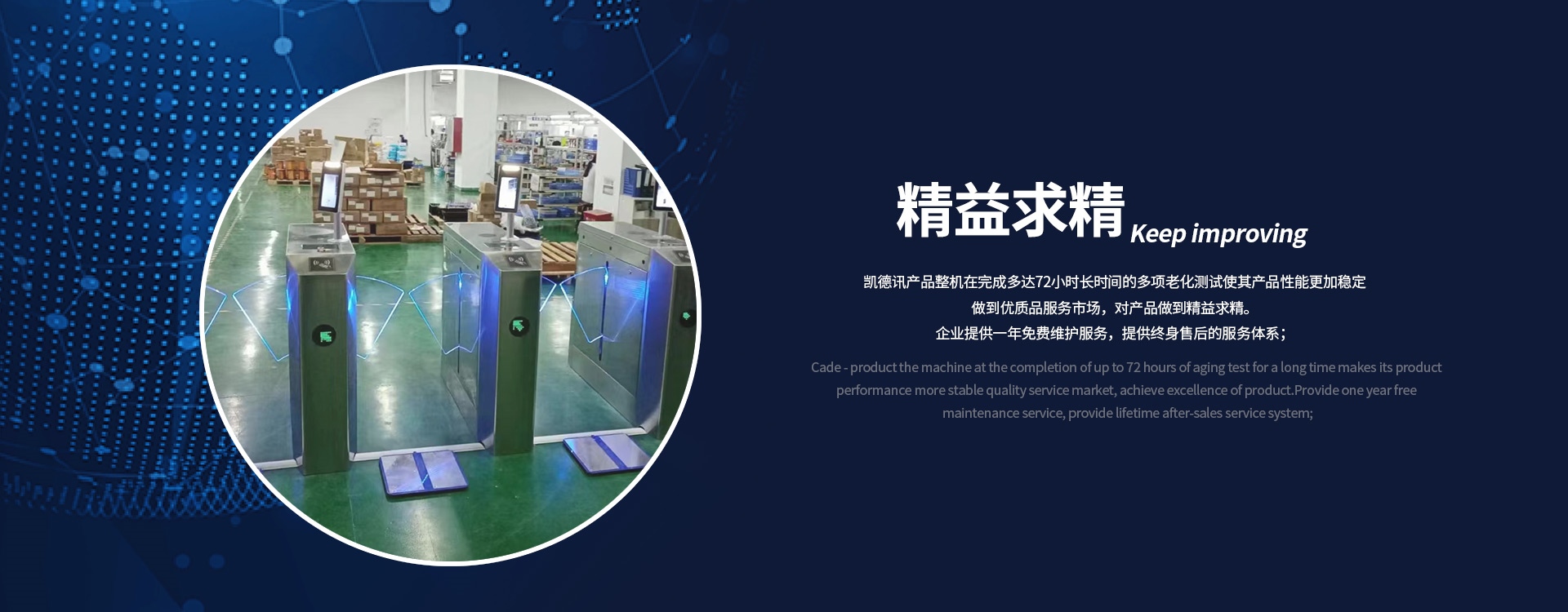 深圳市凱德訊科技有限公司成立于2003年,注冊(cè)資本500萬(wàn)元,位于港珠澳大灣區(qū)的深圳市,公司集研發(fā)、生產(chǎn)、銷售電子行業(yè)防靜電門禁系統(tǒng)和民用智能通道系統(tǒng)的綜合性企業(yè)。公司擁有自主產(chǎn)權(quán)的產(chǎn)品并一直致力于ESD門禁系統(tǒng)、智能安防門禁系統(tǒng)、景區(qū)通道閘機(jī)、人臉識(shí)別閘機(jī)、消費(fèi)系統(tǒng)、智能翼閘的研發(fā)生產(chǎn)與銷售。凱德訊目前擁有多款功能齊全的系統(tǒng)軟件及多款硬件產(chǎn)品,包含成型加工、機(jī)芯研發(fā)、軟件開(kāi)發(fā)等技術(shù)均為本公司自主研發(fā)、獨(dú)立完成。14年來(lái),凱德訊一直秉承以用戶需求為核心,穩(wěn)定、實(shí)用、智能的產(chǎn)品是我們開(kāi)拓市場(chǎng)的基石,務(wù)實(shí)進(jìn)取的精神是我們孜孜不倦的追求,全方位真誠(chéng)的服務(wù)是我們對(duì)您永恒的承諾。